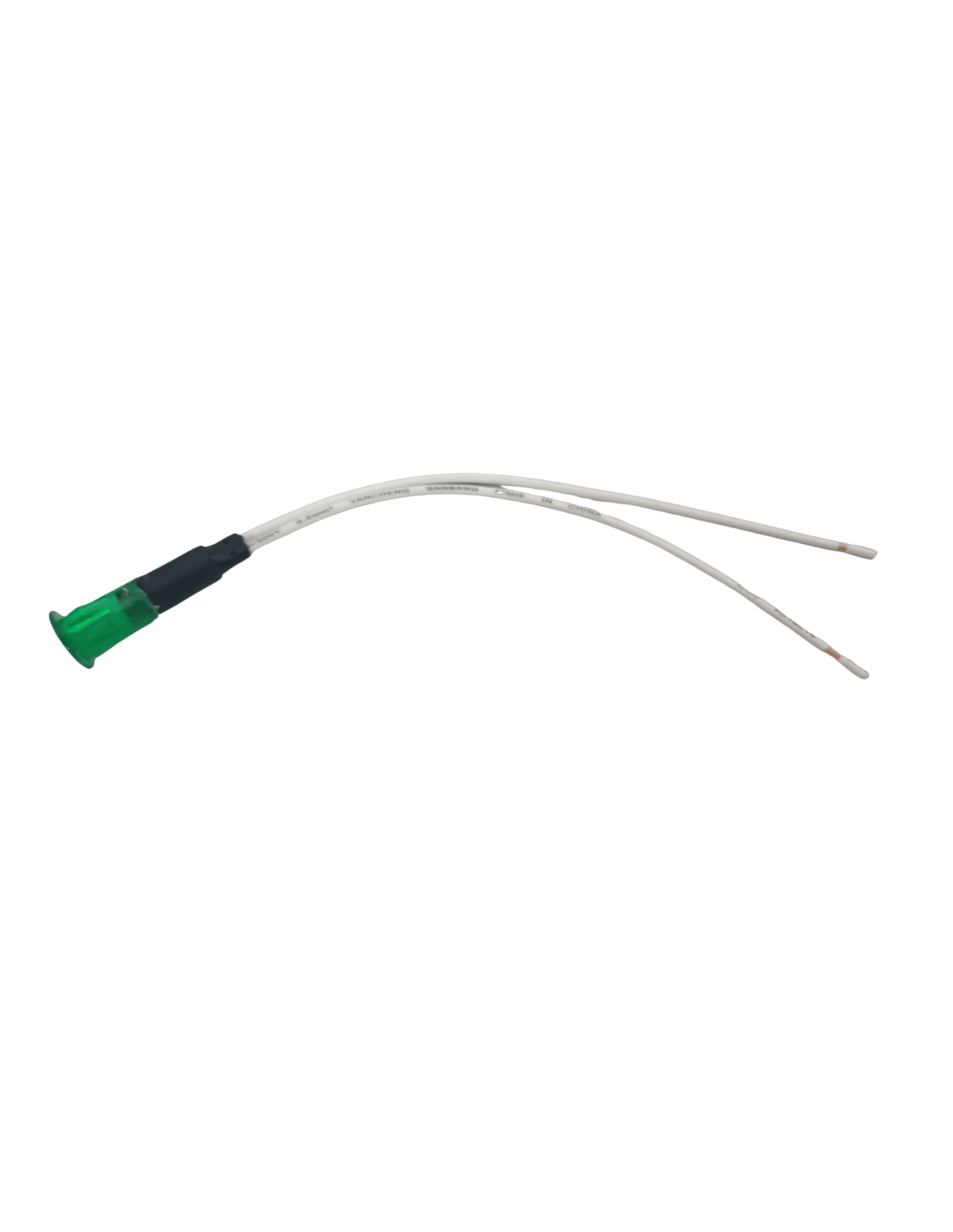 Indicador LED verde de 8 mm, para montagem em painel. Inclui fios com comprimento padrão (~200 mm) para fácil conexão. Ideal para indicar estados em painéis de controlo, debitas ou dispositivos elétricos em instalações industriais ou residenciais (sem exposição a água ou poeiras intensas). Carcaça robusta em plástico e faixa de temperatura de 10 °C a +50 °C, adequada para uso geral em interiores.