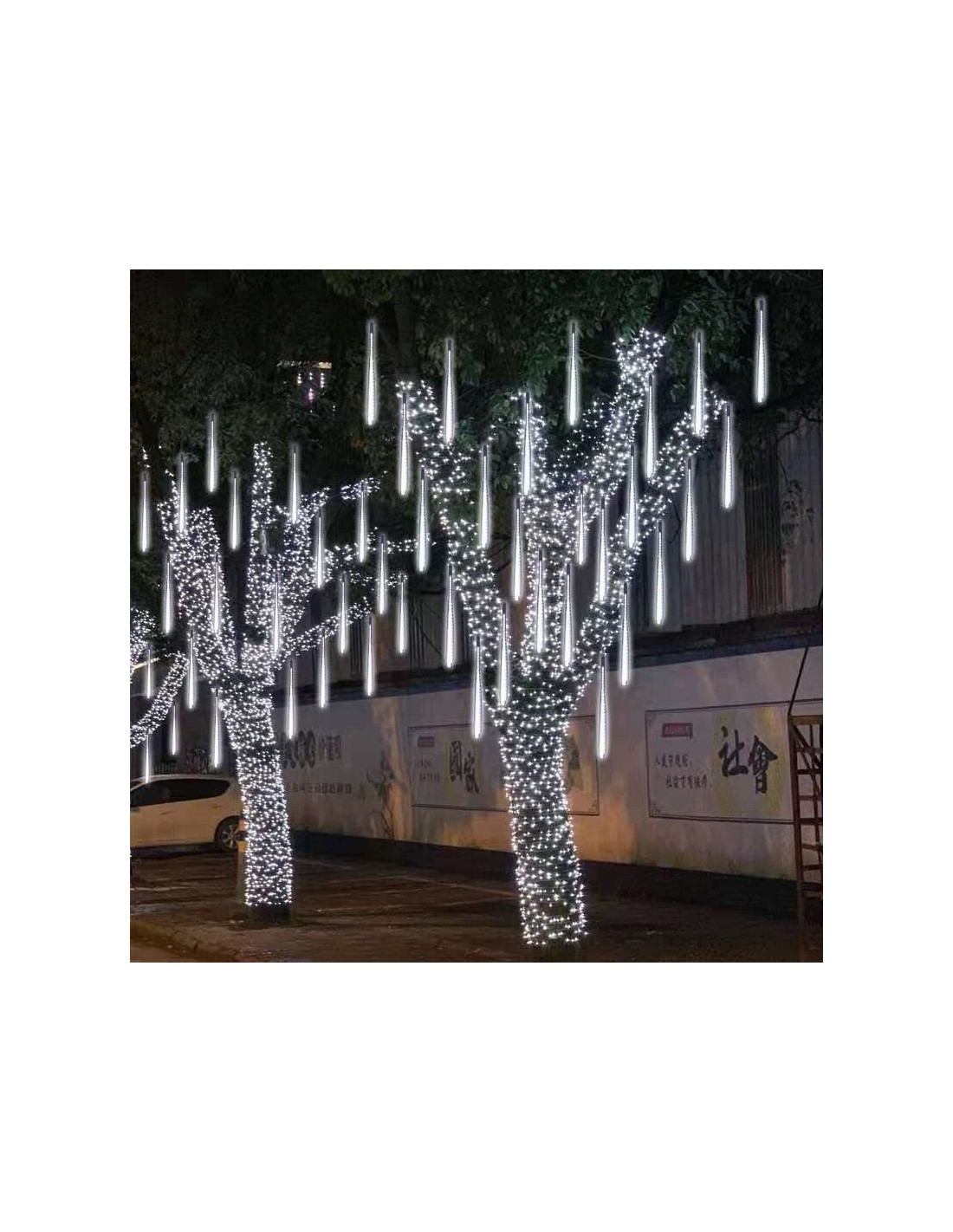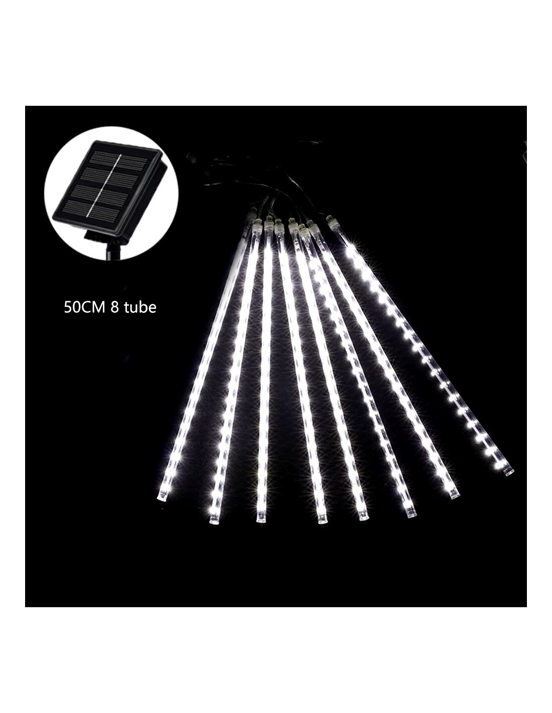 Tubos decorativos solares de efeito “chuveiro” com 50 cm, em luz branca. Ideais para decorações de Natal e exteriores, funcionam com energia solar, oferecendo um efeito visual elegante e sustentável sem necessidade de ligações elétricas.