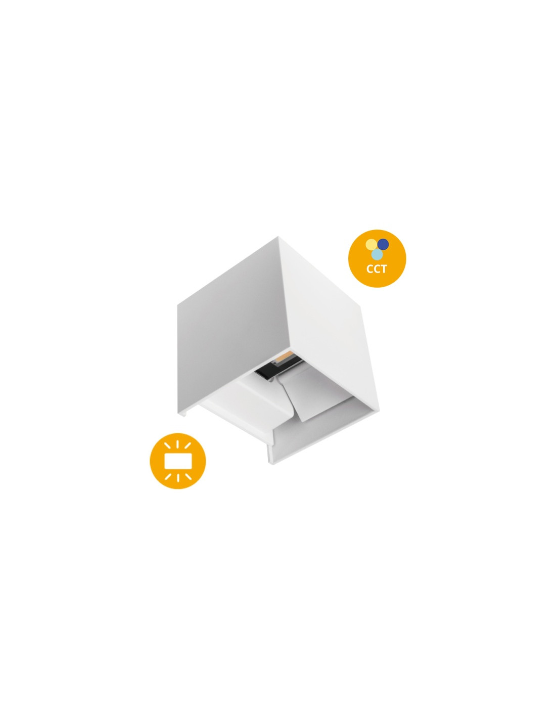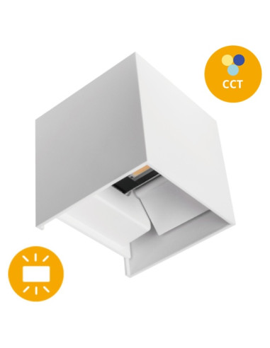 Dentro da secção Exterior, apresentamos o artigo estanque SOR CCT com luz para cima e para baixo. As medidas deste modelo de aplique são de 10 cm de comprimento, 10 cm de largura, 10 cm de altura, em cor branca (IP65). Este artigo possui tecnologia de LED integrado com uma potência de 2x5 watts e 3 cores de luz disponíveis - 3000K | 4000K | 6500K. A selecção da cor de luz que melhor se adpata ao seu espaço é feita no interruptor que existe no interior da base. Este modelo contém 2 módulos LED de 5W. As pálas existentes no aplique permitem ajustar a largura do feixe de luz.
