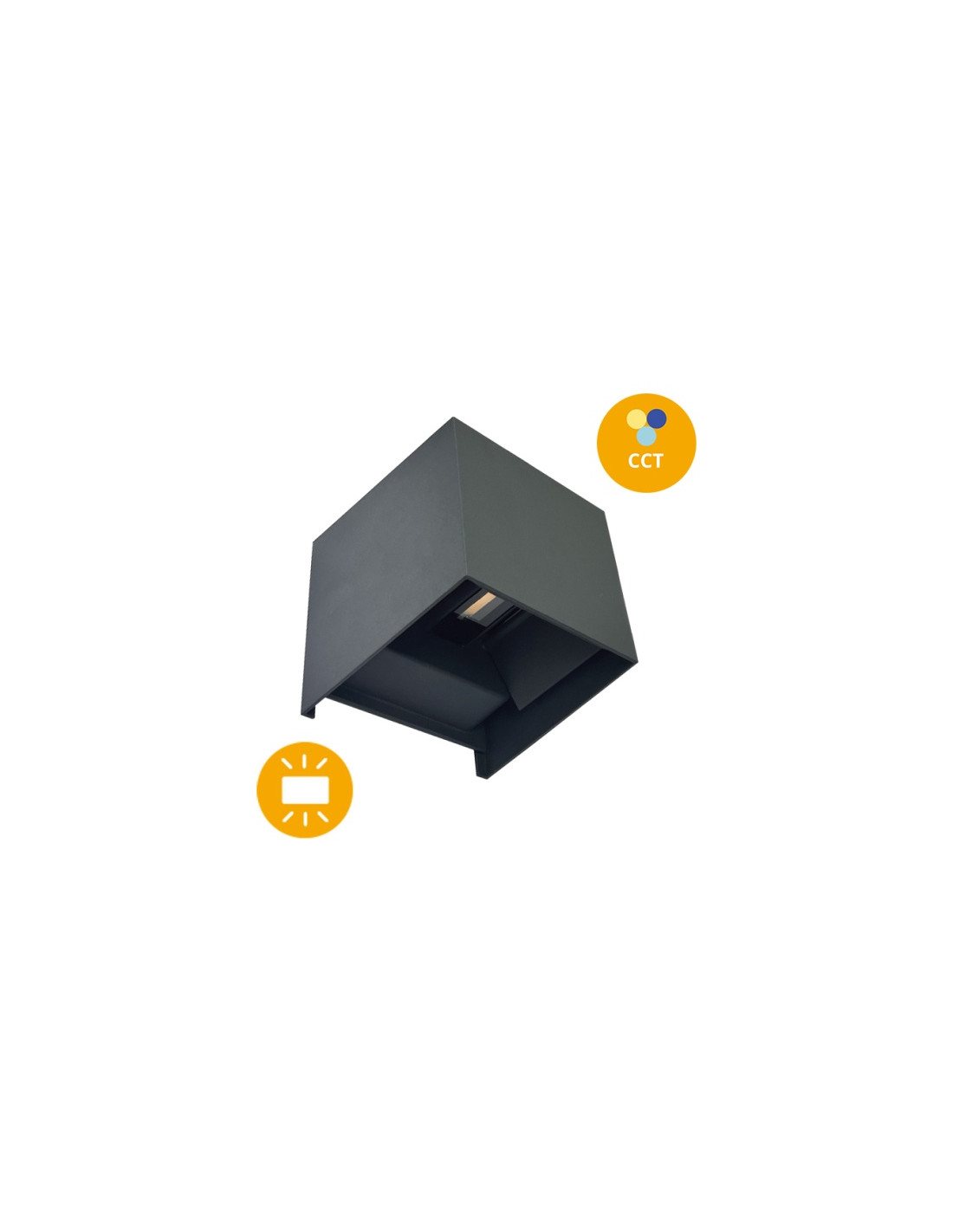 Dentro da secção Exterior, apresentamos o artigo estanque SOR CCT com luz para cima e para baixo. As medidas deste modelo de aplique são de 10 cm de comprimento, 10 cm de largura, 10 cm de altura, em cor antracite (IP65). Este artigo possui tecnologia de LED integrado com uma potência de 2x5 watts e 3 cores de luz disponíveis - 3000K | 4000K | 6500K. A selecção da cor de luz que melhor se adpata ao seu espaço é feita no interruptor que existe no interior da base. Este modelo contém 2 módulos LED de 5W. As pálas existentes no aplique permitem ajustar a largura do feixe de luz.