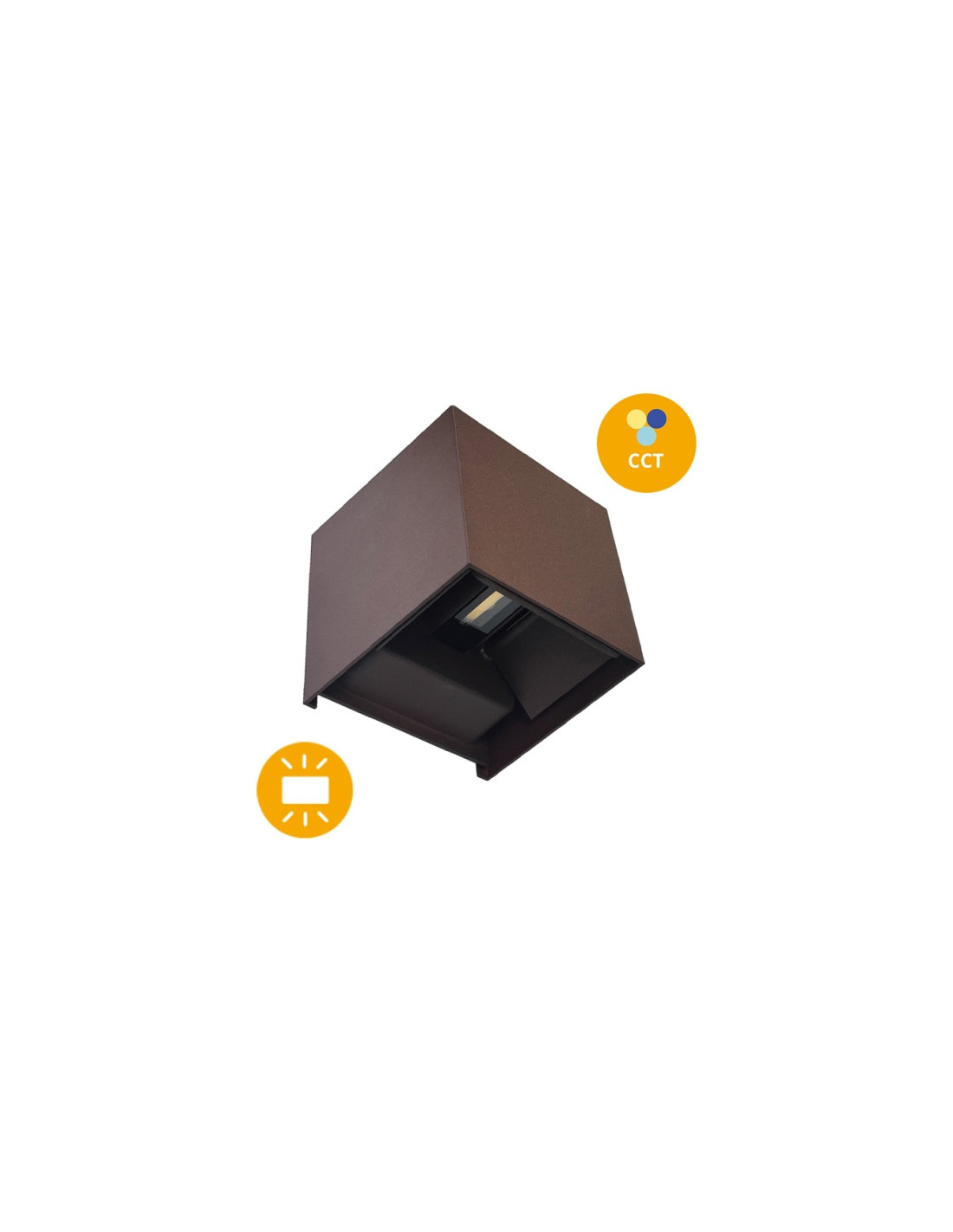 Dentro da secção Exterior, apresentamos o artigo estanque SOR CCT com luz para cima e para baixo. As medidas deste modelo de aplique são de 10 cm de comprimento, 10 cm de largura, 10 cm de altura, em cor ferrugem (IP65). Este artigo possui tecnologia de LED integrado com uma potência de 2x5 watts e 3 cores de luz disponíveis - 3000K | 4000K | 6500K. A selecção da cor de luz que melhor se adpata ao seu espaço é feita no interruptor que existe no interior da base. Este modelo contém 2 módulos LED de 5W. As pálas existentes no aplique permitem ajustar a largura do feixe de luz.