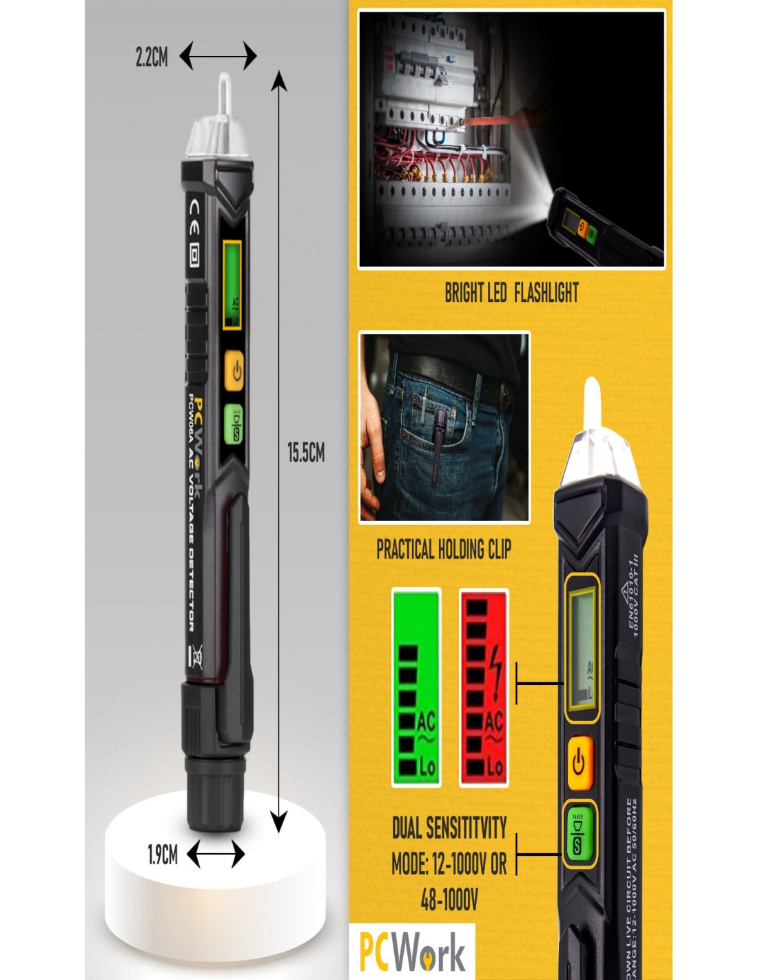 O PCW06A permite testes de tensão fáceis e detecção segura de quebra de tensão. Com o prático clipe de retenção (como uma caneta) e sua lanterna LED brilhante, o detector de tensão PCW06A é uma ferramenta conveniente para profissionais e amadores.
